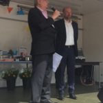 Om 13.00 uur werd het jubileumfeest geopend door wethouder Grauss door het leeggooien van een zakje doppen in de verzamelzakken voor stichting Geleidehond. Zelfs heeft hij even meegedaan aan het stoepranden, waarvoor hij tot zijn verrassing een medaille kreeg.