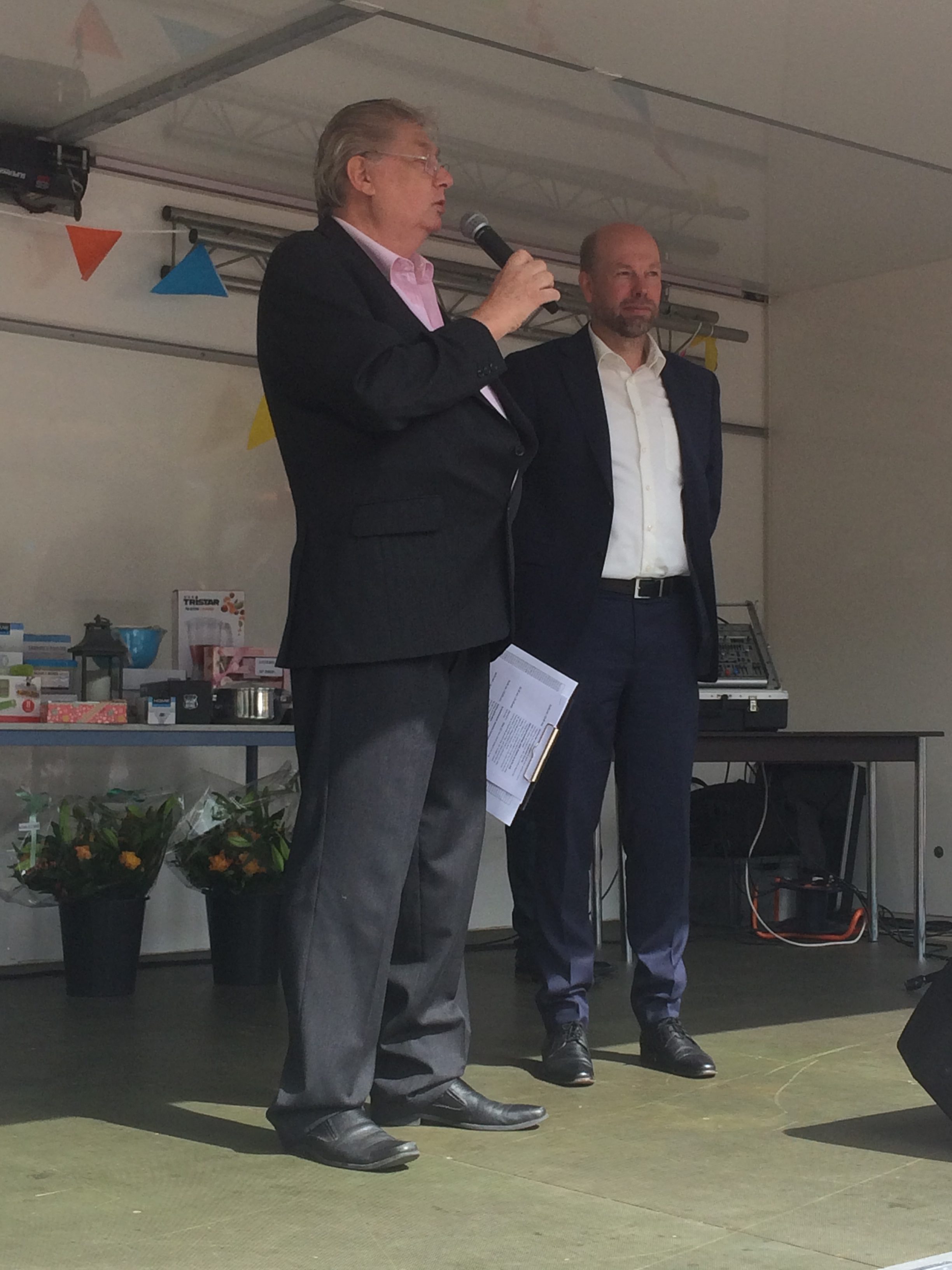 Om 13.00 uur werd het jubileumfeest geopend door wethouder Grauss door het leeggooien van een zakje doppen in de verzamelzakken voor stichting Geleidehond. Zelfs heeft hij even meegedaan aan het stoepranden, waarvoor hij tot zijn verrassing een medaille kreeg.