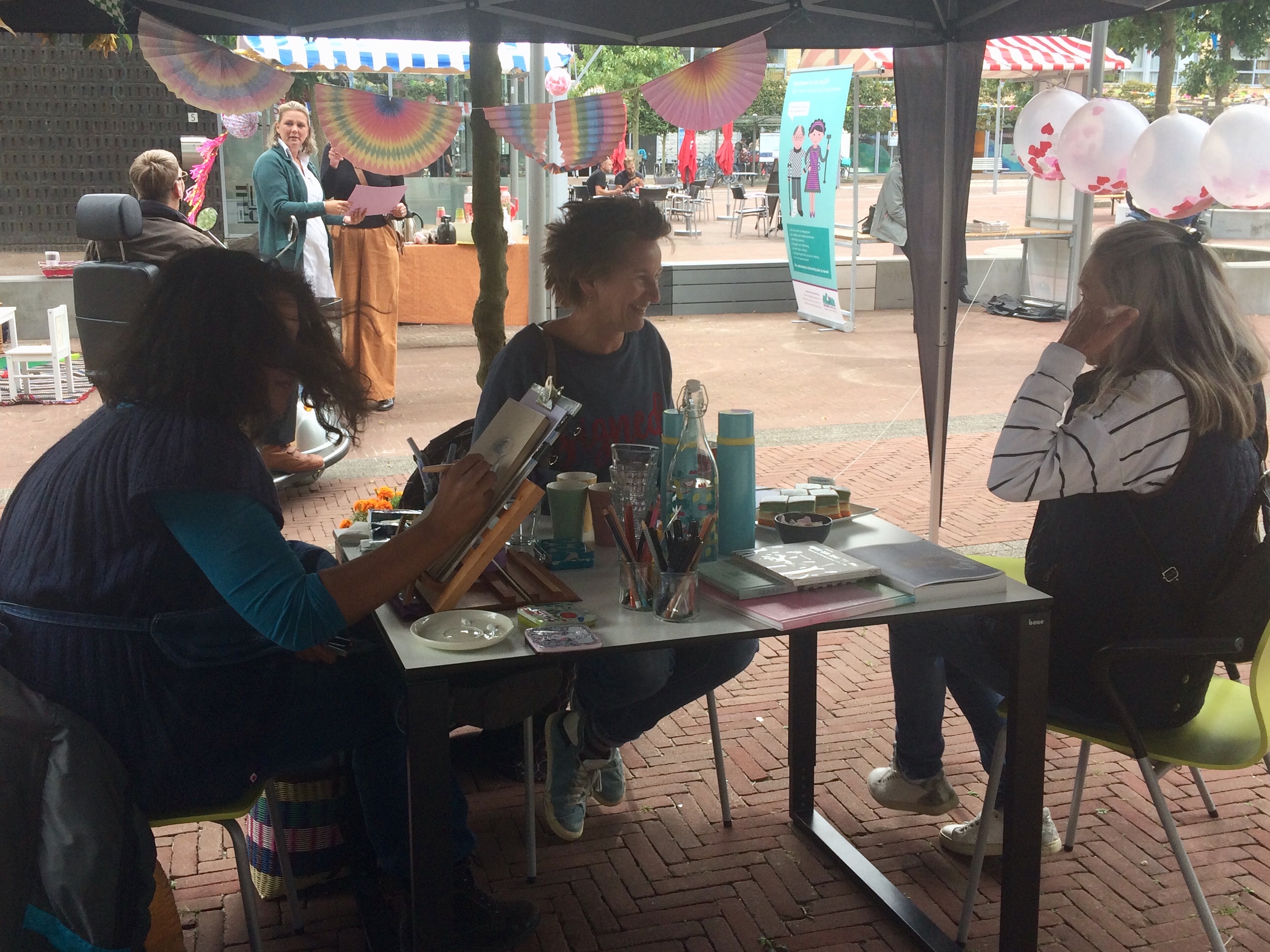 Op het plein waren diverse snuffelmarkt kramen, waar veel mensen hun slag konden slaan. De kramen van de organisaties werden ook druk bezocht. Vooral bij de kraam van Onze Woning waren de prachtige taartjes in trek! In de partytent ernaast werden verhalen opgetekend én de verhalers uit 110-Morgen getekend voor het boekje dat ter gelegenheid van het 100-jarige bestaan van Onze Woning wordt gemaakt.